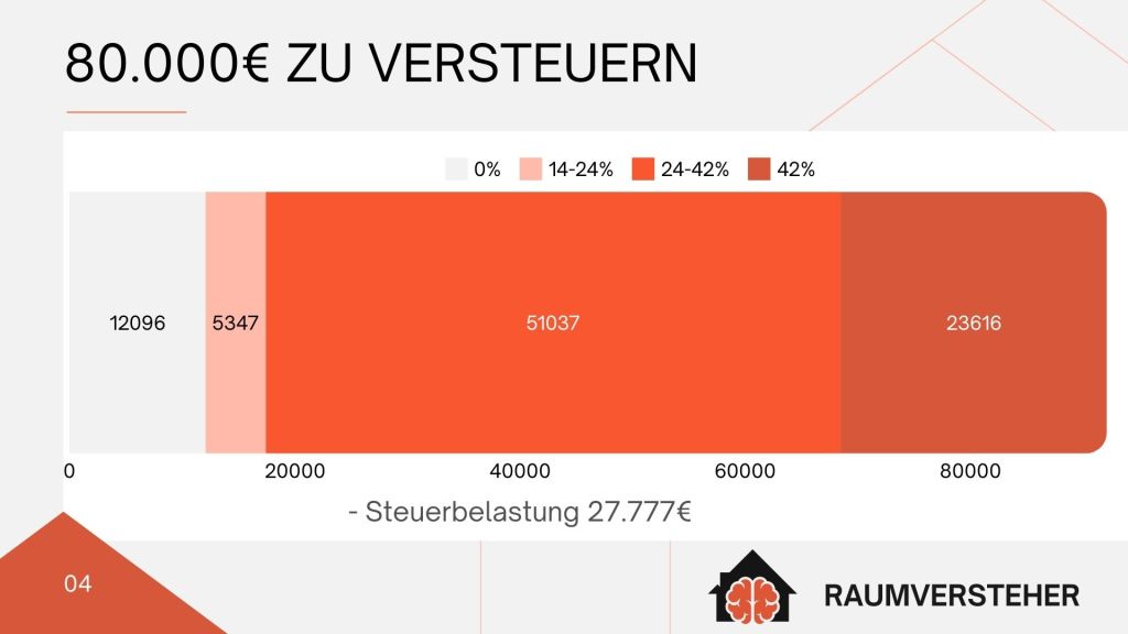 - Ausgangssituation: Eine Person verdient 100.000 € brutto im Jahr. Nach Abzug von Freibeträgen und Sonderausgaben bleibt ein zu versteuerndes Einkommen von 80.000 €. Ohne Abschreibungen liegt die Steuerlast bei etwa 27.777 €.